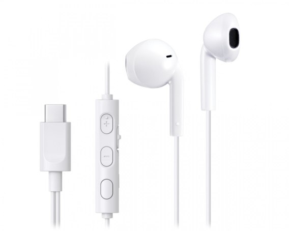 Słuchawki douszne USB-C z pilotem z łatwymi do wciśnięcia przyciskami i włączaniem/wyłączaniem mikrofonu.