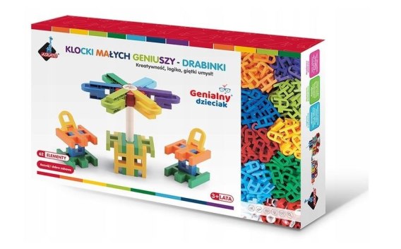 62 elementy w 8 kolorach pozwalają stoworzyć fantastyczne, przestrzenne figury, zaczynając od tych prostych, takich jak krzesło, poprzez nieco trudniejszego psa lub helikopter.