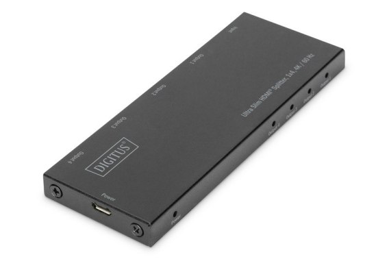 Wysokowydajny rozgałęźnik HDMI firmy DIGITUS rozprowadza sygnały audio i wideo z urządzenia HDMI na maksymalnie cztery ekrany, telewizory lub rzutniki w rozdzielczości UHD 4K /60 Hz. Rozgałęźnik HDMI może być zasilany przez istniejący port USB w telewizorze lub alternatywnie przez adapter ładowania USB. Istnieje możliwość kaskadowania wielu rozgałęzień aż do 8 poziomów.