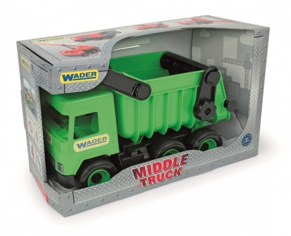 Wywrotka posiada otwierany kiper z rączką. Zasuwka zabezpiecza samoczynne otwieranie kipra. Zapakowany w kolorowy karton.