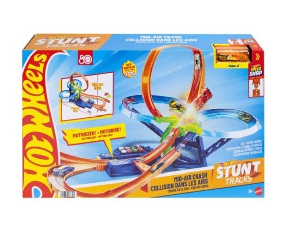 - Zestaw Hot Wheels Stunt Tracks Mid-Air Crash zawiera ulubione przez dzieci wyścigi, akrobacje i zderzenia z silnikiem i samochodzikiem Hot Wheels!