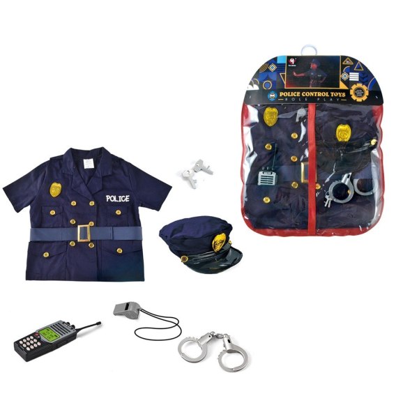 W zestawie: koszula z krótkim rękawem i paskiem zapinana na rzepy, czapka, odznaka, kajdanki, gwizdek i krótkofalówka.