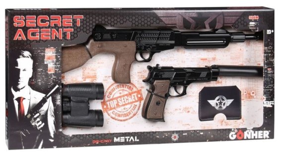 Zestaw zawiera: metalowy karabin i pistolet na 8 naboi z magazynkiem, lornetkę oraz legitymację tajnego agenta. Wiek: 3+.